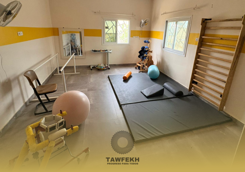 En Mbour, TAWFEKH dispone de una sala de fisioterapia infantil que hemos acondicionado de forma progresiva junto al equipo local, apostando por soluciones sostenibles fabricadas in situ: colchones, espaldera y barras paralelas. El espacio cuenta además con ventiladores, una fuente de agua, un espejo terapéutico y materiales adaptados, incluidos dos bipedestadores donados desde España.
